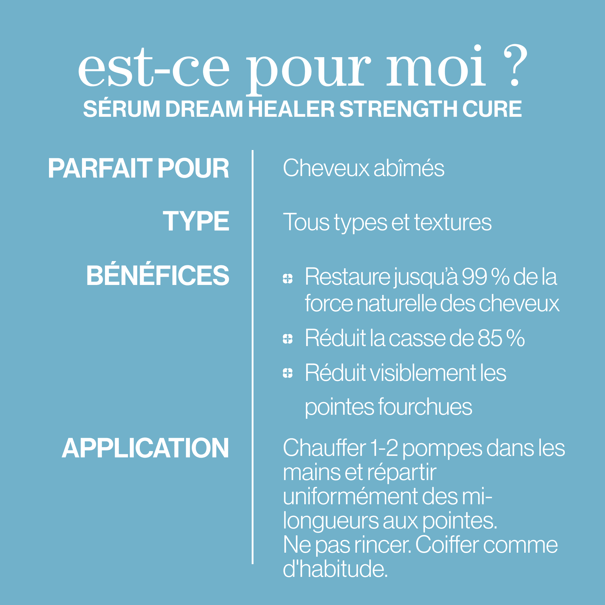 - Convient aux cheveux colorés et toutes les textures de cheveux.