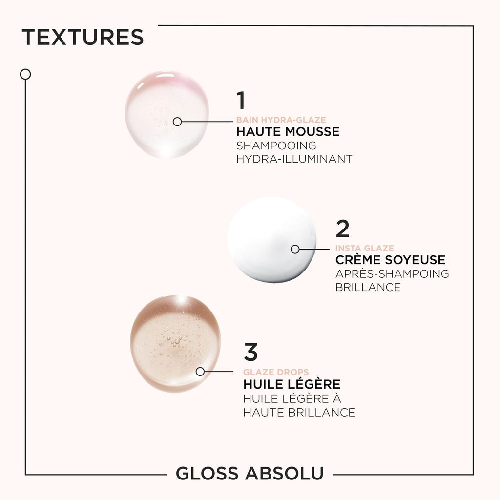 Le Shampooing Hydra-Glaze nettoie délicatement tout en révélant une brillance immédiate. Le Fondant Insta Glaze hydrate intensément, facilite le démêlage et transforme la fibre pour un toucher soyeux. Enfin, l’Huile Glaze Drops apporte une finition ultra-légère, intensifie l’éclat et offre douceur, fluidité et contrôle des frisottis sans alourdir. Un rituel complet pour des cheveux lumineux, souples et parfaitement lissés.
