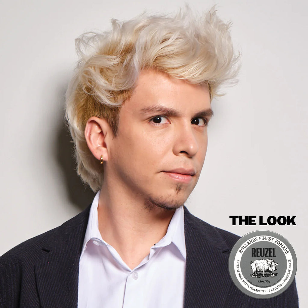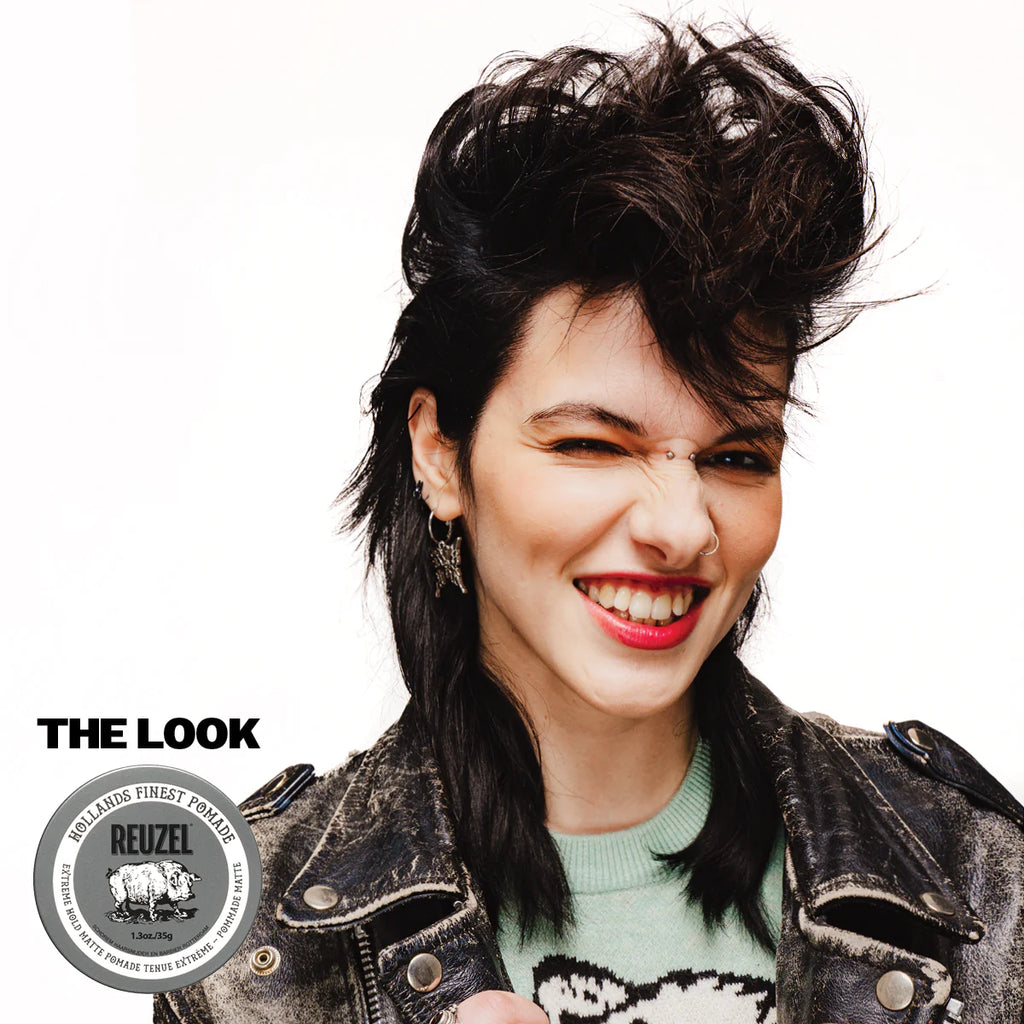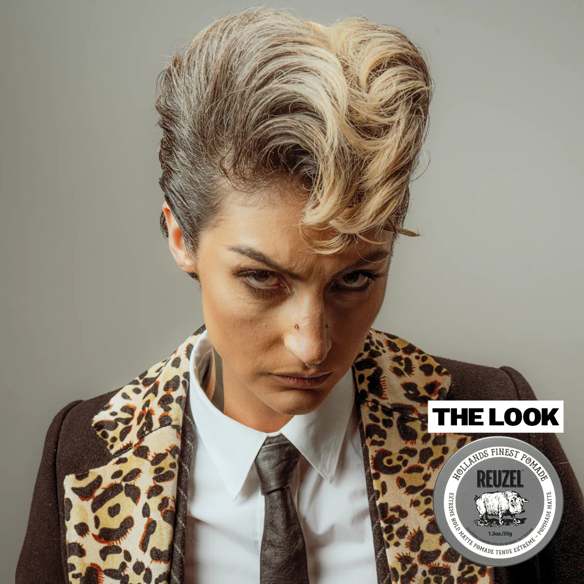 Conseil : Pour une tenue extrême : appliquez la Pommade Extreme Hold Matte sur cheveux humides à la racine, puis utilisez la Pommade Rose sur les pointes une fois les cheveux secs. La combinaison la plus puissante pour un maintien qui résiste à tout !