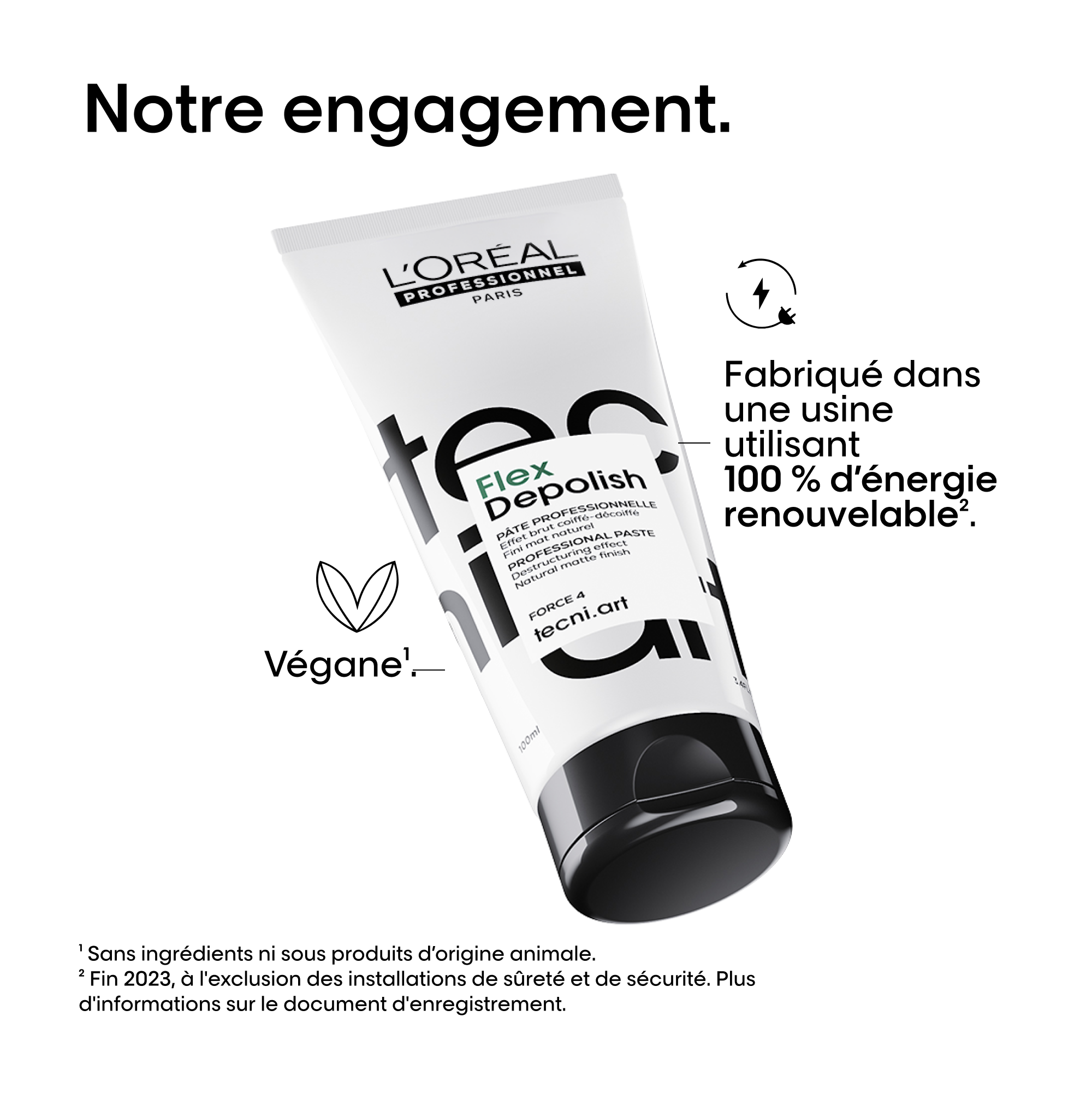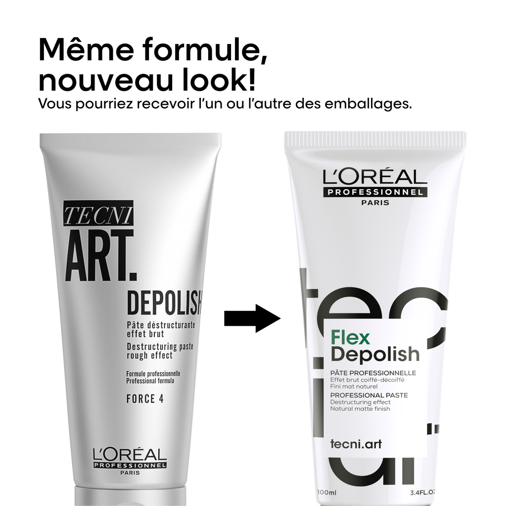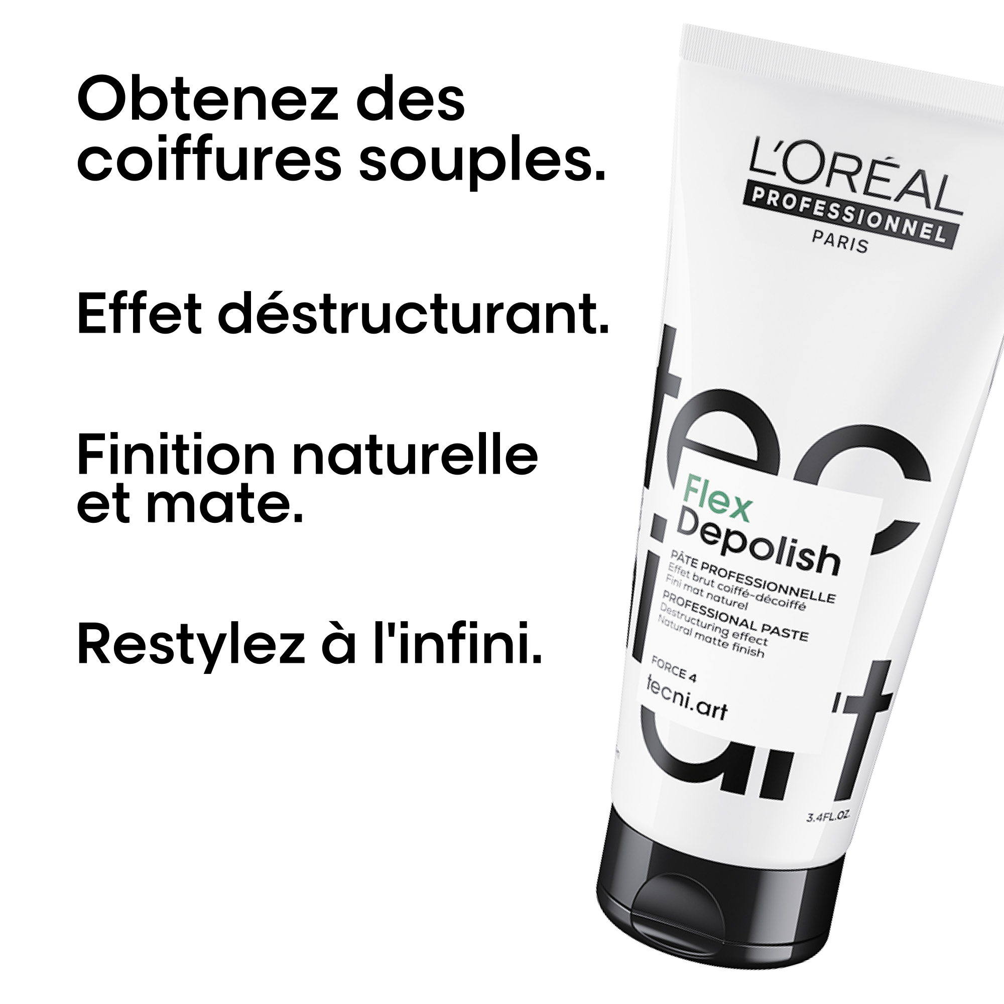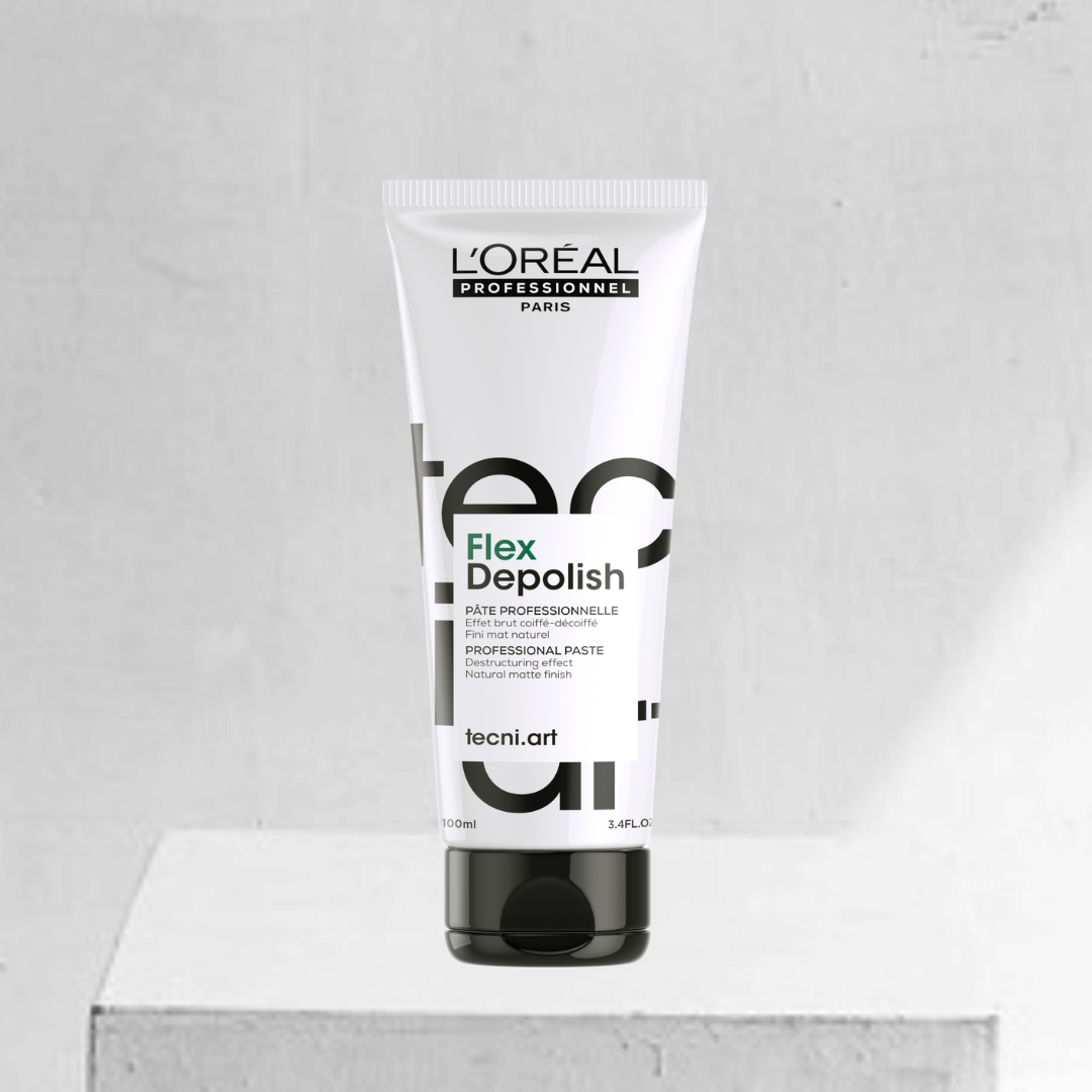 La pâte destructurante Tecni.Art Depolish de L’Oréal Professionnel est idéale pour déconstruire et matifier les cheveux pour un look brut et décoiffé. Peut être remodelé sans fin.
