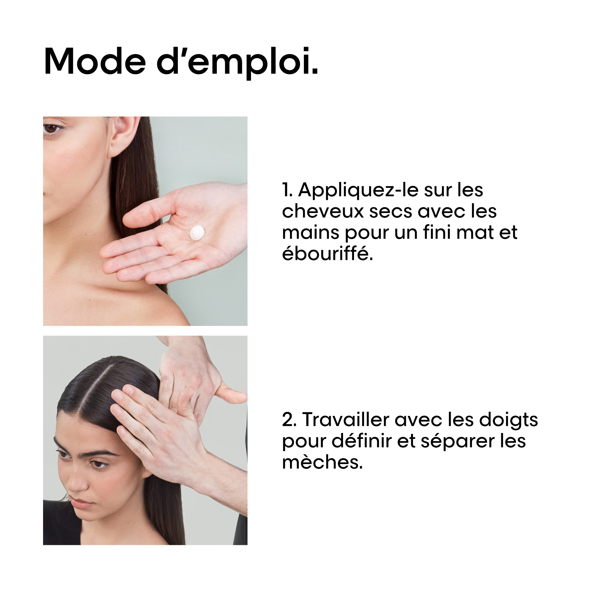 Appliquer à la main sur cheveux secs pour une finition mate et décoiffée. Pour plus de définition, utiliser les doigts afin de séparer les mèches.