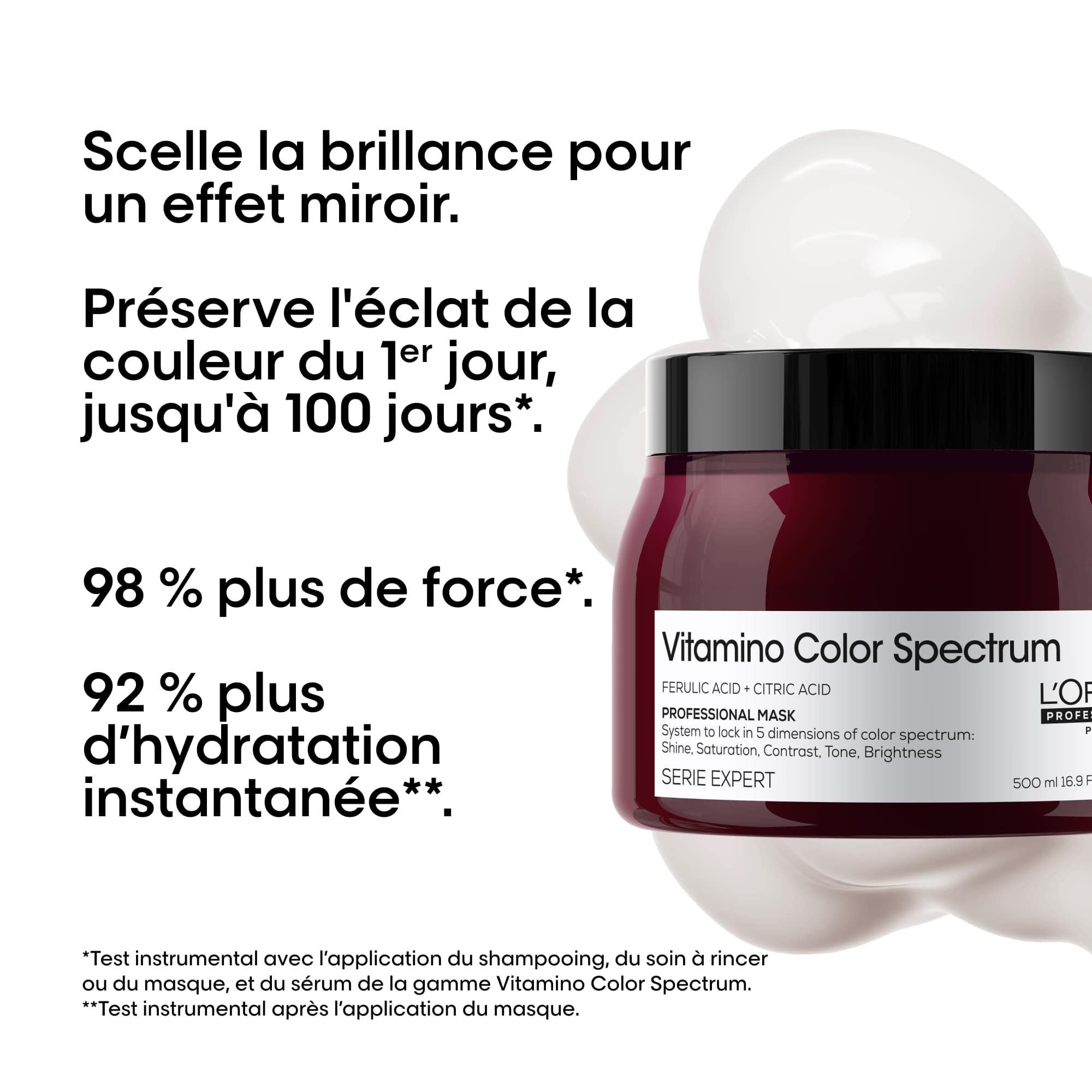 - *Test instrumental avec l'application du shampooing, du revitalisant ou du masque et du sérum Vitamino Color Spectrum après 4 semaines. **Test instrumental avec l'application du shampooing, du revitalisant ou du masque et du sérum Vitamino Color Spectrum.