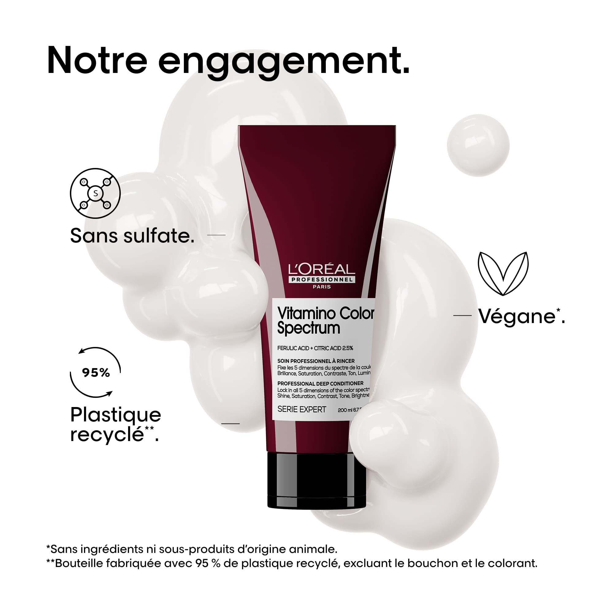 La formule brevetée du Revitalisant Vitamino Color Spectrum, est à base d'acide férulique et d'acide citrique. De plus, découvrez un parfum distinctif aux notes fruitées, florales et ambrées.