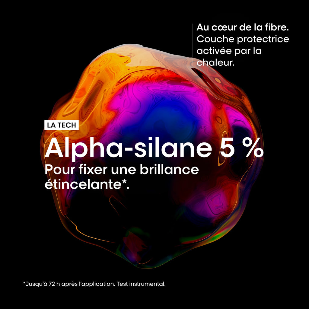 L'alpha-silane 5% pour fixer une brillance étincelante qui va jusqu'au coeur de la fibre du cheveux. Couche protectrice activée par la chaleur.