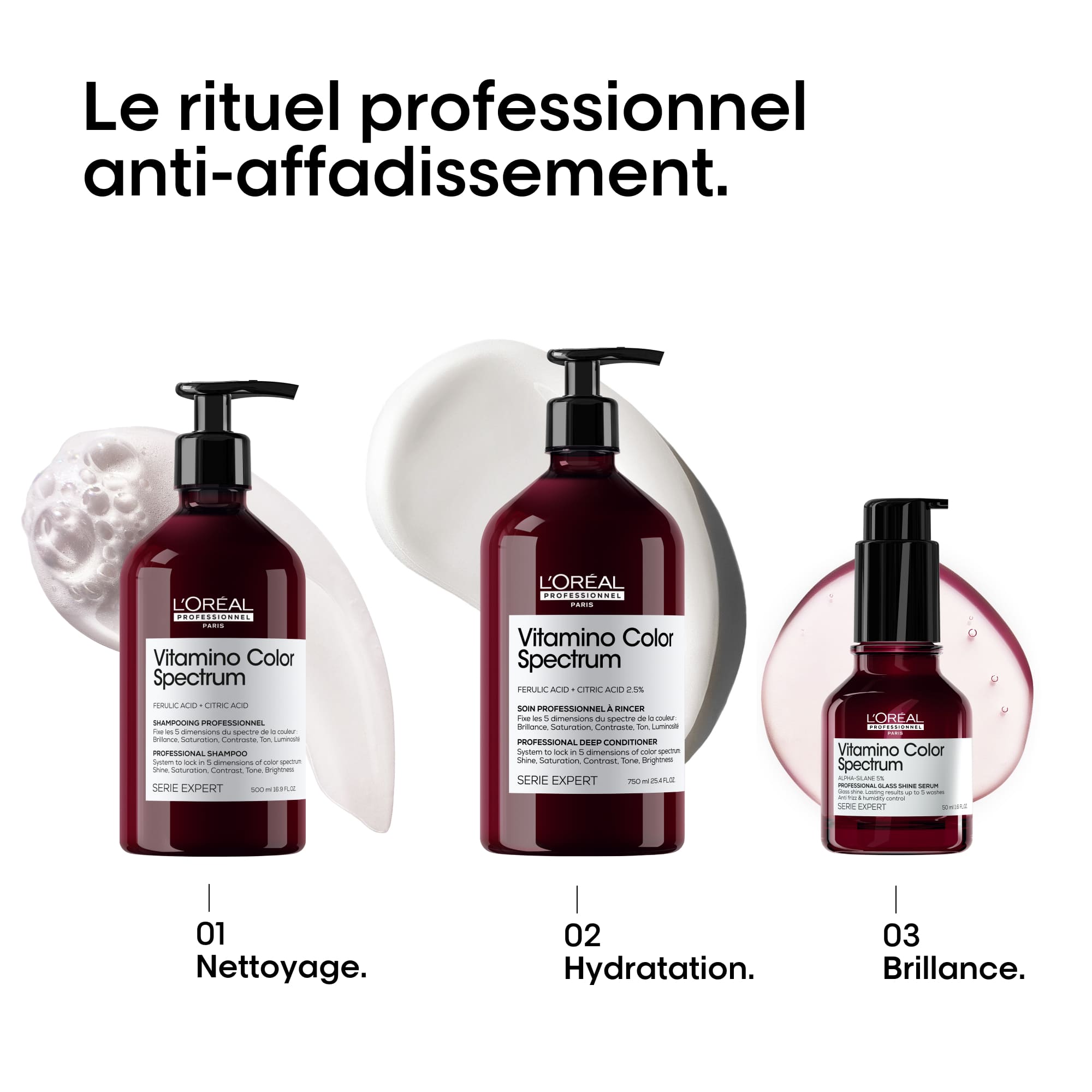 Étape 3 : Rincez abondamment. Pour un résultat optimal, poursuivez avec le revitaliant ou le masque Vitamino Color Spectrum et le sérum Glass Shine.