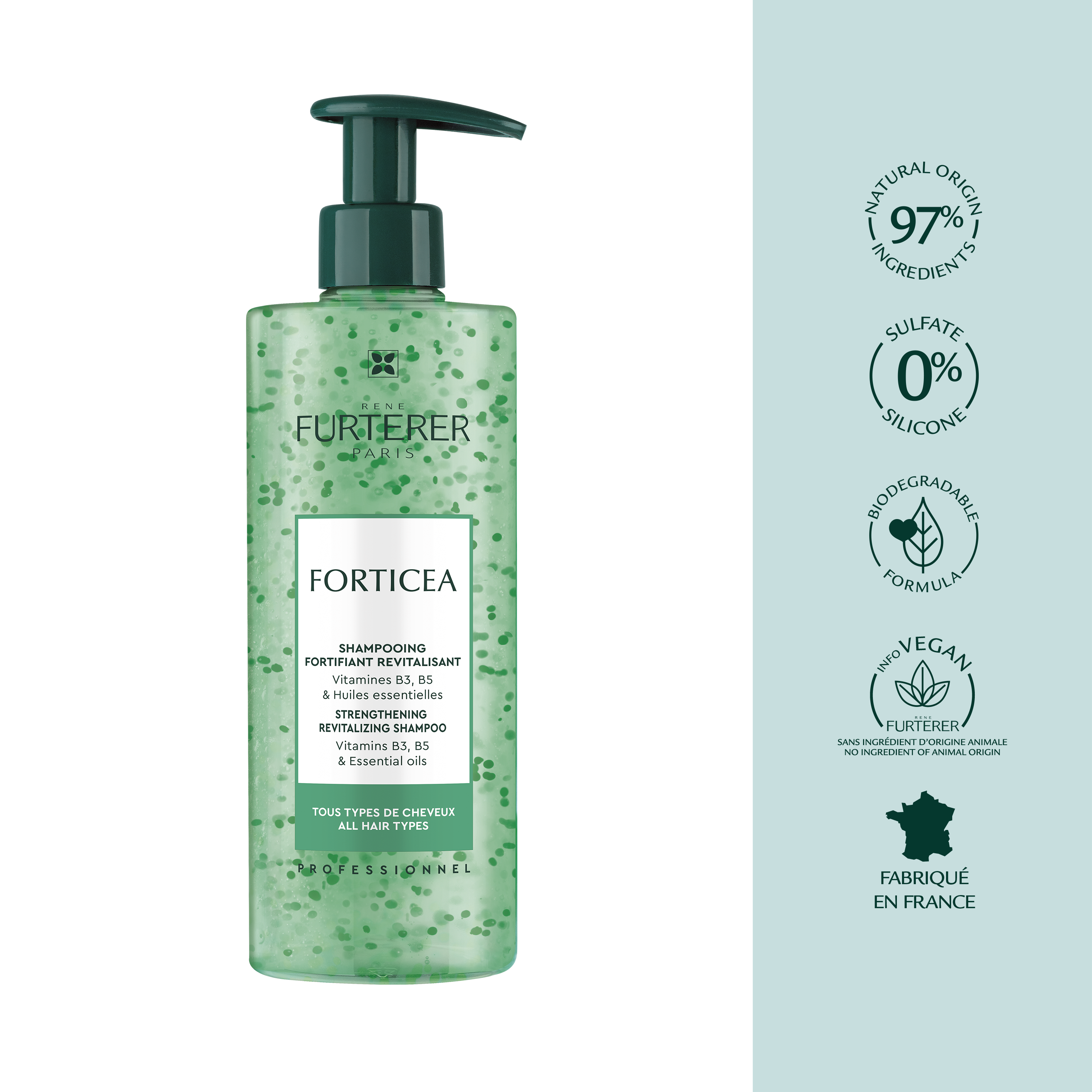 Forticea shampooing énergisant fournit des nutriments essentiels et des éléments énergétiques pour renforcer les cheveux sur une base quotidienne. Les cheveux deviennent plus vigoureux, débordant d'énergie et de vitalité. La texture transparente et pétillante révèle de nombreuses biosphères d'huiles essentielles vertes qui éclatent doucement au bout des doigts lors de l'application pour libérer leurs pouvoirs précieux dans une mousse crémeuse.